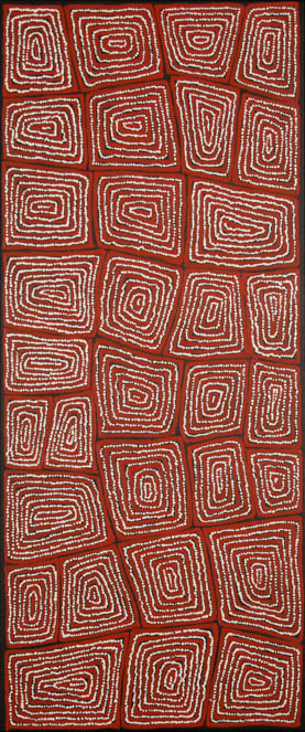This painting represents the Tingari Cycle Dreaming. The Tingari Cycle incorporates the sacred sites visited along the way by ancestral spirits and also refers to the song cycles, which describe and connect the artist to this journey. The Tingari cycle refers to ‘Secret Mens Business’ and is important in a young man’s journey from boyhood to manhood.