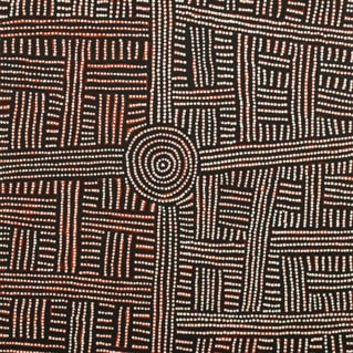 This painting depicts the journeys taken by Bambatu’s ancestors. Here she pays homage to the waterholes and paths taken by the Pintupi women. In the centre of this intricate and well-structured painting is the waterhole and ceremonial site, with the crossed pathways of dotted lines helping to tell the many travelling stories of Bambatu’s ancestors.