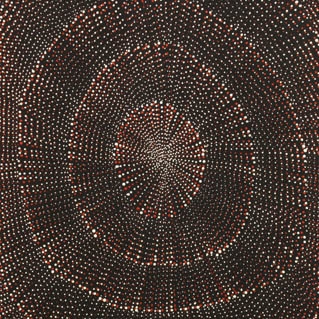 This painting depicts the sandhills of the Kintore region. It portrays winds and the desert environment after rain, and the seasonal changes in the desert landscape. Water holes, mountains and environmental influences are represented throughout the works. Dulcie is given permission to paint these contemporary interpretations through her artistic lineage to her family and from her famous mother, Lily Kelly Napangardi.